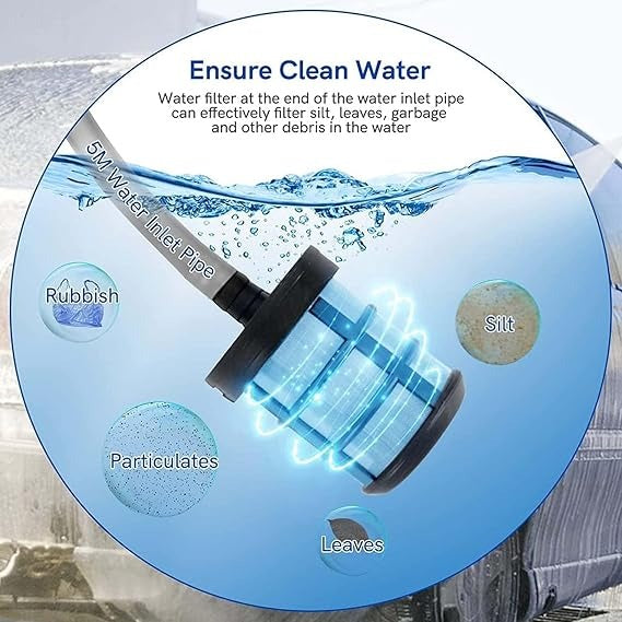 • DRAWS WATER FROM ANYWHERE - Comes with a 5M long garden hose, allow you to draw water from any fresh water source like a pool, lake, or bucket and . You can hook up to a garden hose at the house or even a 2L bottle on the go.
